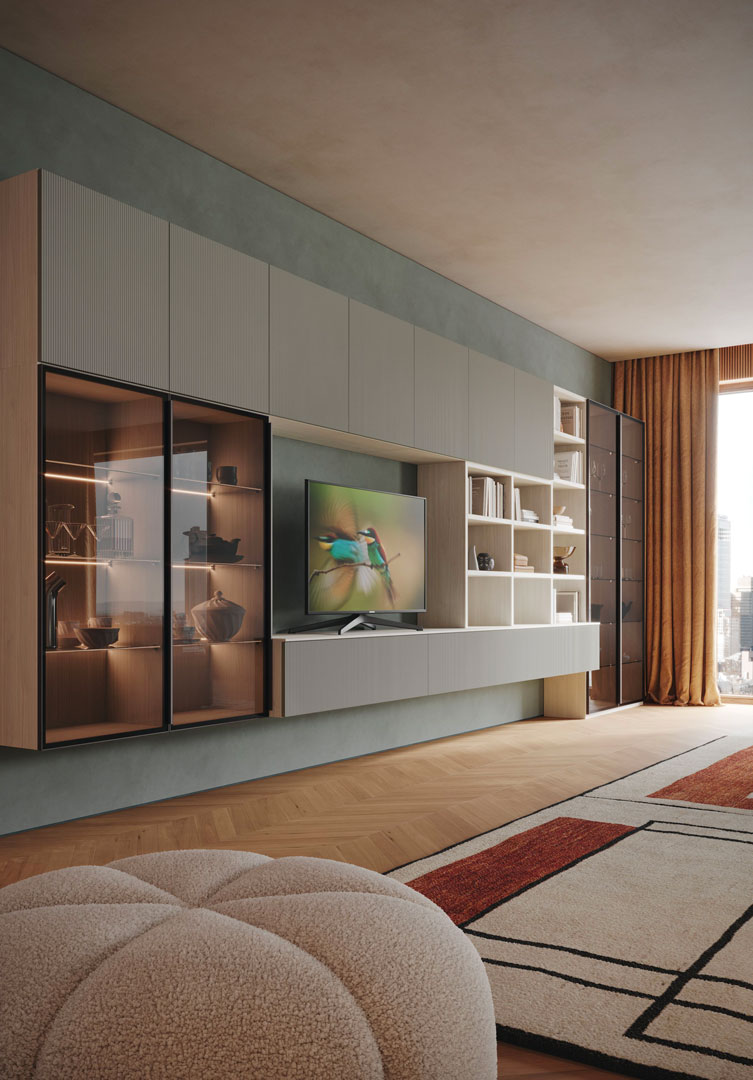 Si tratta di una vasta gamma di proposte con mobili soggiorno componibili sospesi dotati di mensole, vani, ante e cassetti per disporre televisione, libri, dvd, oggetti e fotografie.