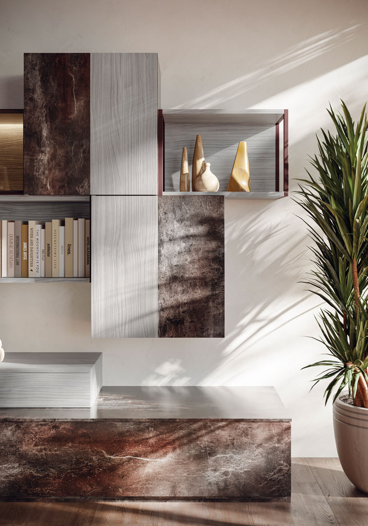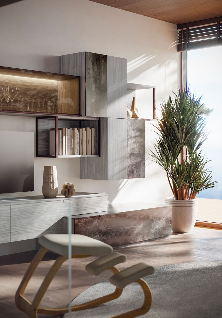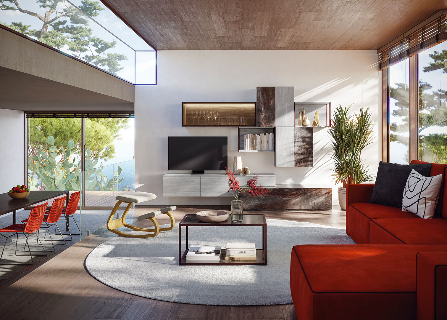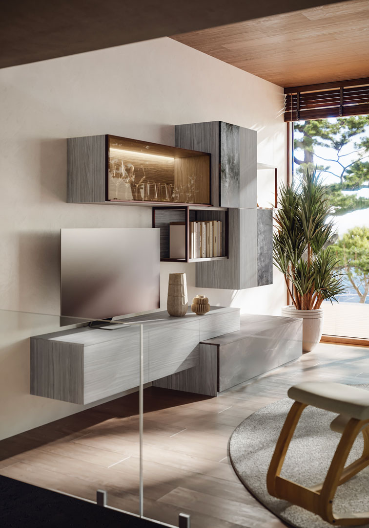 Si tratta di una vasta gamma di proposte con mobili soggiorno componibili sospesi dotati di mensole, vani, ante e cassetti per disporre televisione, libri, dvd, oggetti e fotografie.
