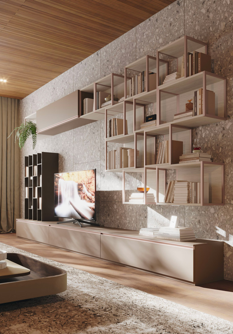 Si tratta di una vasta gamma di proposte con mobili soggiorno componibili sospesi dotati di mensole, vani, ante e cassetti per disporre televisione, libri, dvd, oggetti e fotografie.