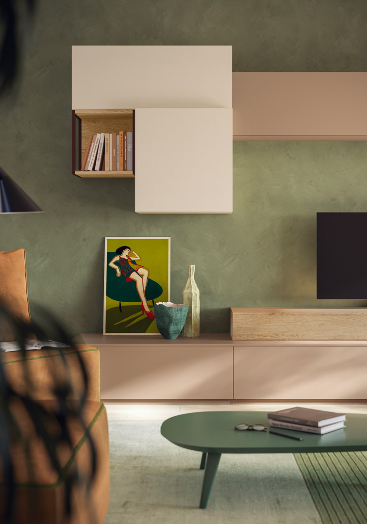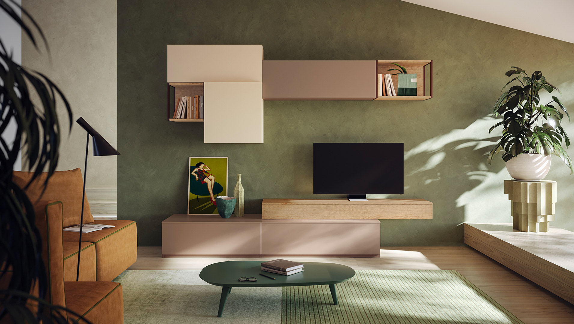 Si tratta di una vasta gamma di proposte con mobili soggiorno componibili sospesi dotati di mensole, vani, ante e cassetti per disporre televisione, libri, dvd, oggetti e fotografie.