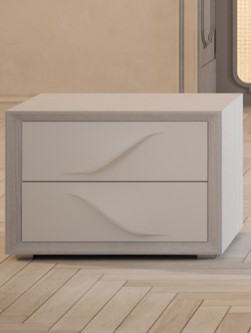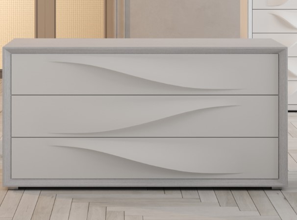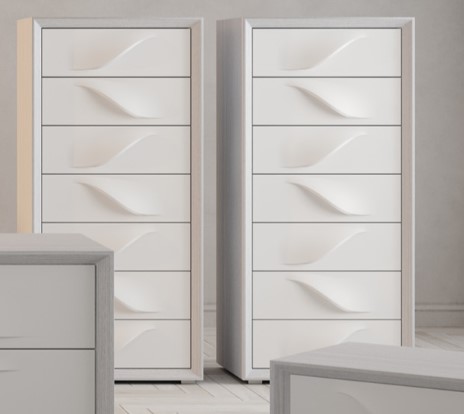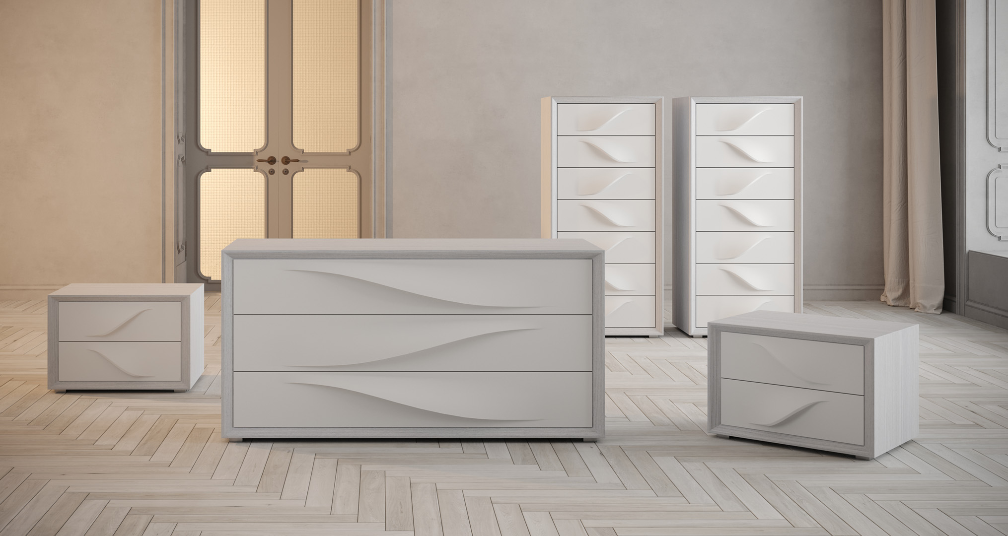 Comò,  comodini e settimini in bianco per arredare la camera da letto. Si tratta di un gruppo letto moderno dai frontali intagliati come una scultura.