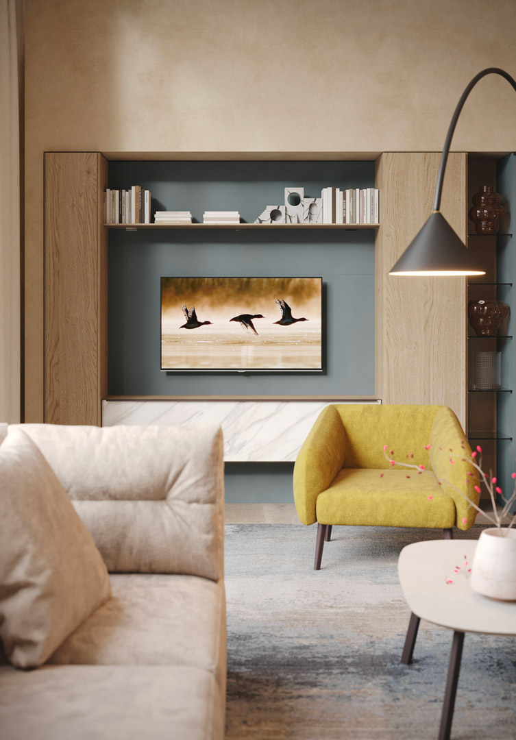 Soluzioni dal design contemporaneo, librerie a muro con scaffali e scomparti per fare spazio a libri, tv e souvenir.