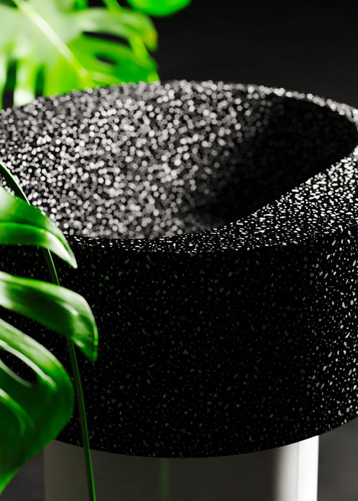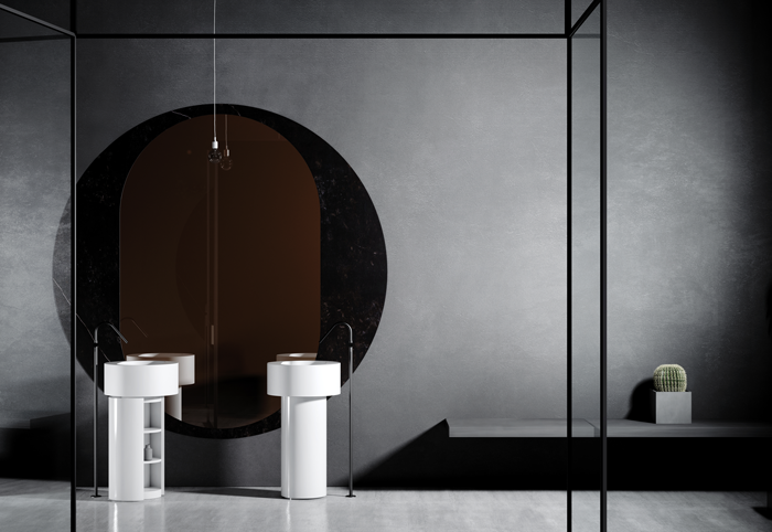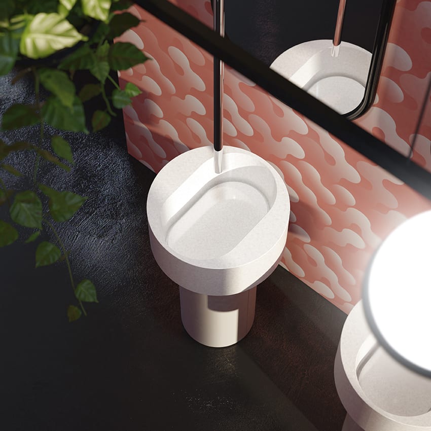 Questo modello, dotato di mobile-basamento in legno, presenta due varianti di ciotola, coordinabili, in Luxolid® e Luxolid® LAPILLUS™.