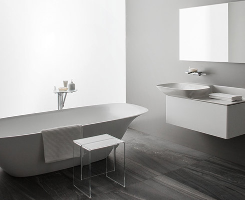 – Vasca da bagno centro stanza, solid surface Sentec: 1700 x 750 x 520 mm (lunghezza, larghezza, altezza).