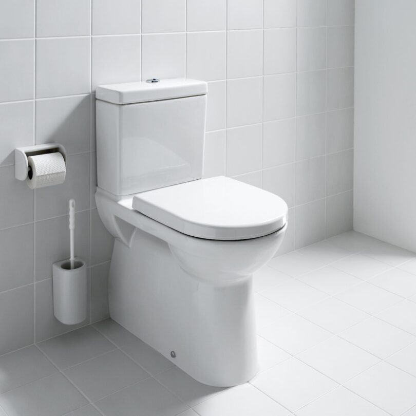 Combipack per vaso a pavimento, a cacciata, incl. cassetta di risciacquo, con seduta WC con coperchio ‘slim’ e sistema a caduta automatica.