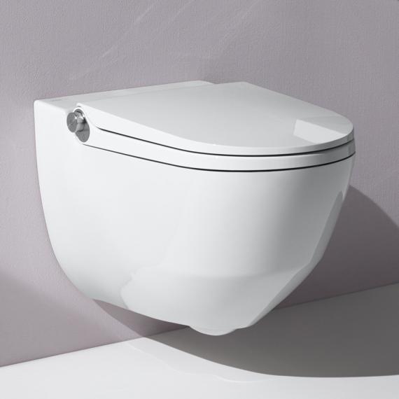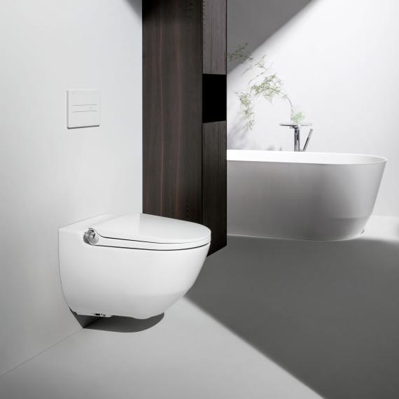 WC con doccia, a parete, a cacciata, senza brida di risciacquo, incl. seduta WC con coperchio, rimovibile, con sistema a caduta automatica, incl. telecomando con touch-screen.