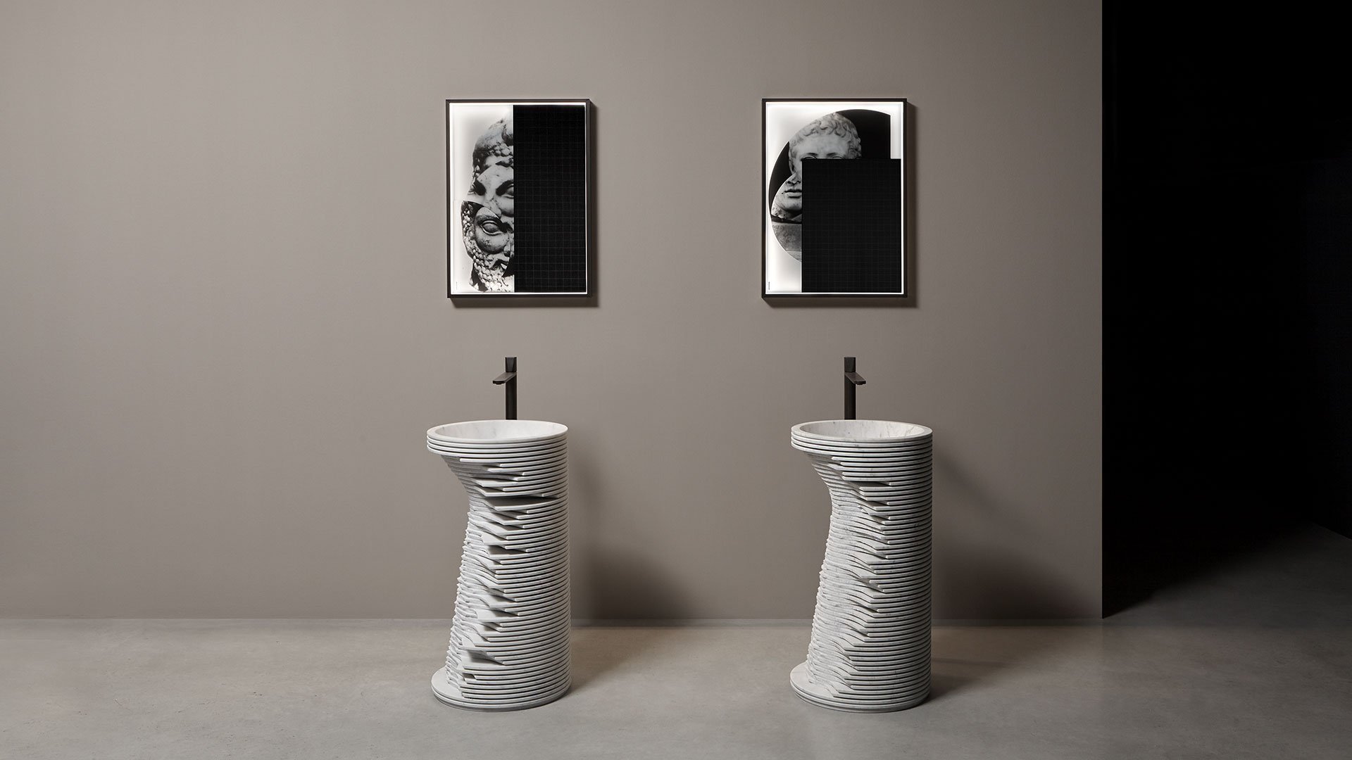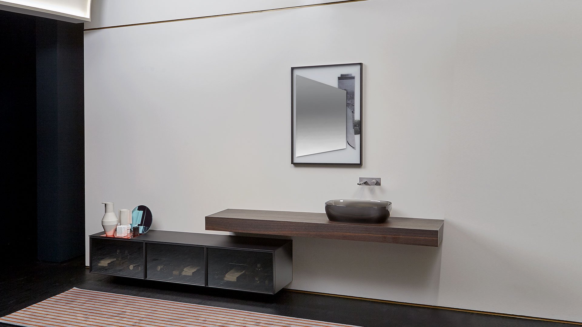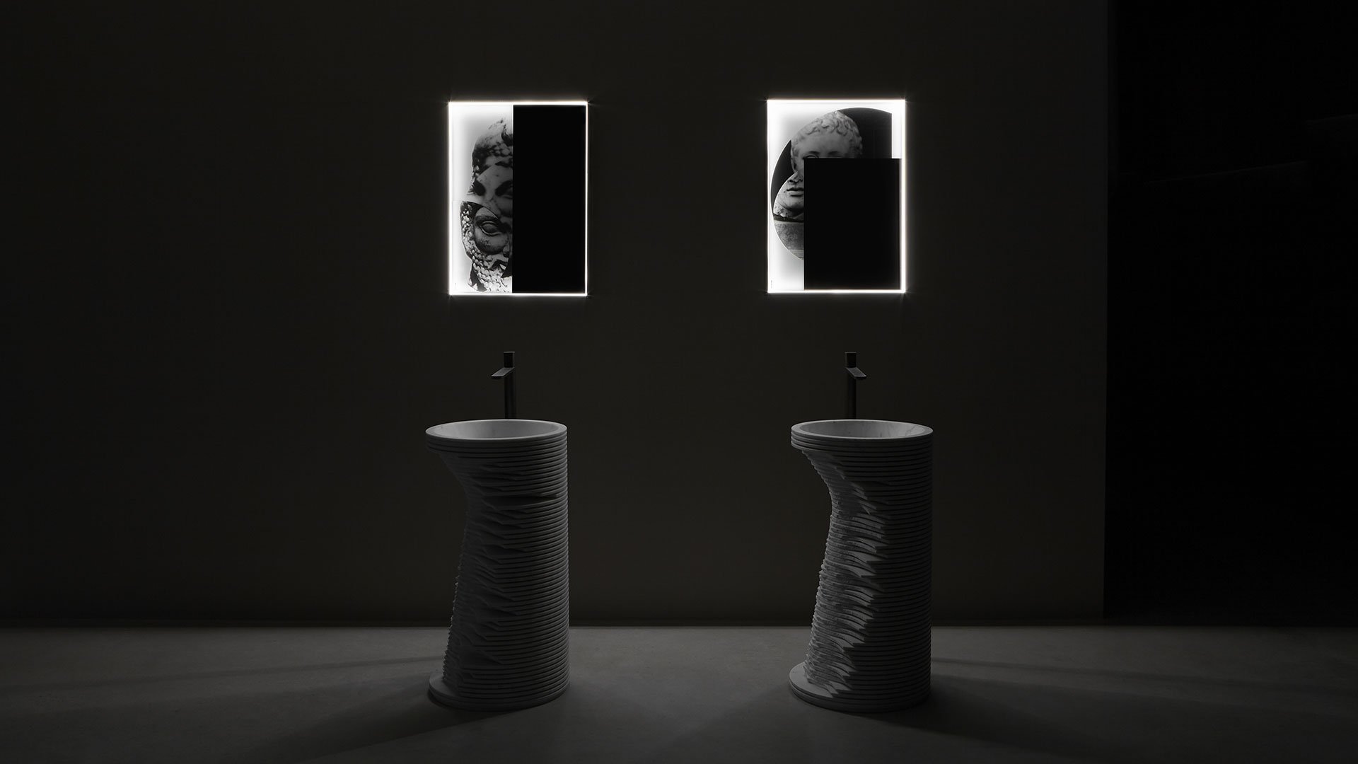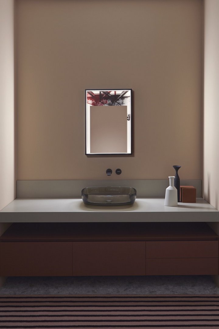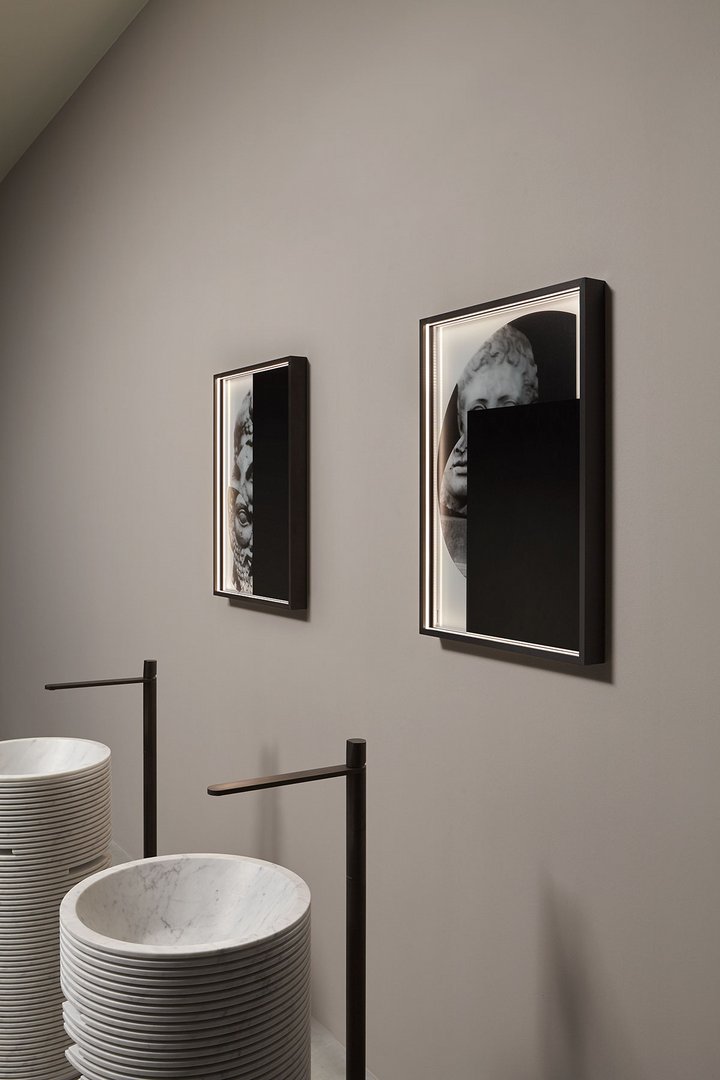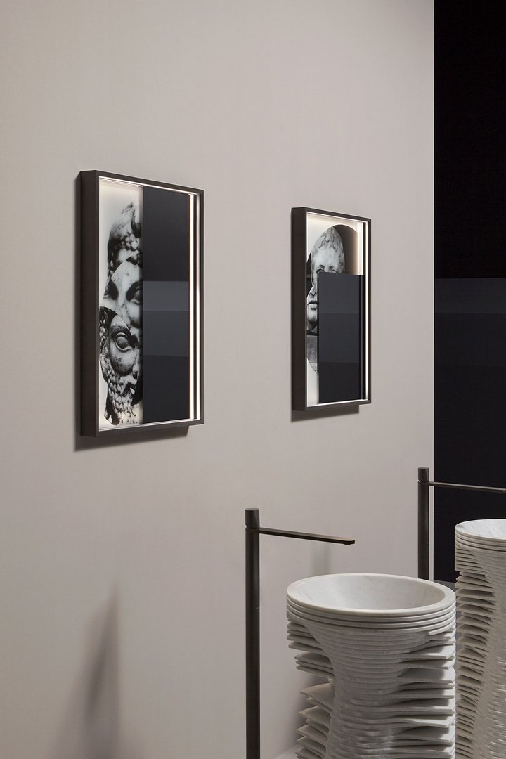 The common thread between art and design is now a distinctive sign of antoniolupi’s work. More than fusion, we would refer to two different experiences mixed together to achieve a common goal: an univocal experience of beauty that becomes part of our daily life. Luca Galofaro, Architect and Teacher, has focused his attention on relationships between representation, urban architecture and image. An area of antoniolupi showroom La Pietra e il Fuoco in Stabbia is currently hosting an Exhibition/Architecture Drawing Collection curated by Galofaro himself: an important step forward in the company’s growth strategy. Now Galofaro ‘influences’ some antoniolupi products with his vision and the collaboration between him and Andrea Lupi is becoming even closer:some Architecture Drawings of the exhibition have been chosen to be used on antoniolupi mirrors. Transforming some of these works in real furniture objects was a natural consequence of the reflection shared by Galofaro and Andrea Lupi. The idea consists of transferring an image used to think of architecture to an item of everyday life, building a bridge between imagination, which dominates art, and life, normally dominated by the function of the object. The collage technique is based on overlapping fragments. The image comes from the stratification of images of memory. Mirrors are made overlapping printed glass plates, creating tridimensional collages. The last mirrored layer establishes a relationship with the observer, who becomes part of the image itself.