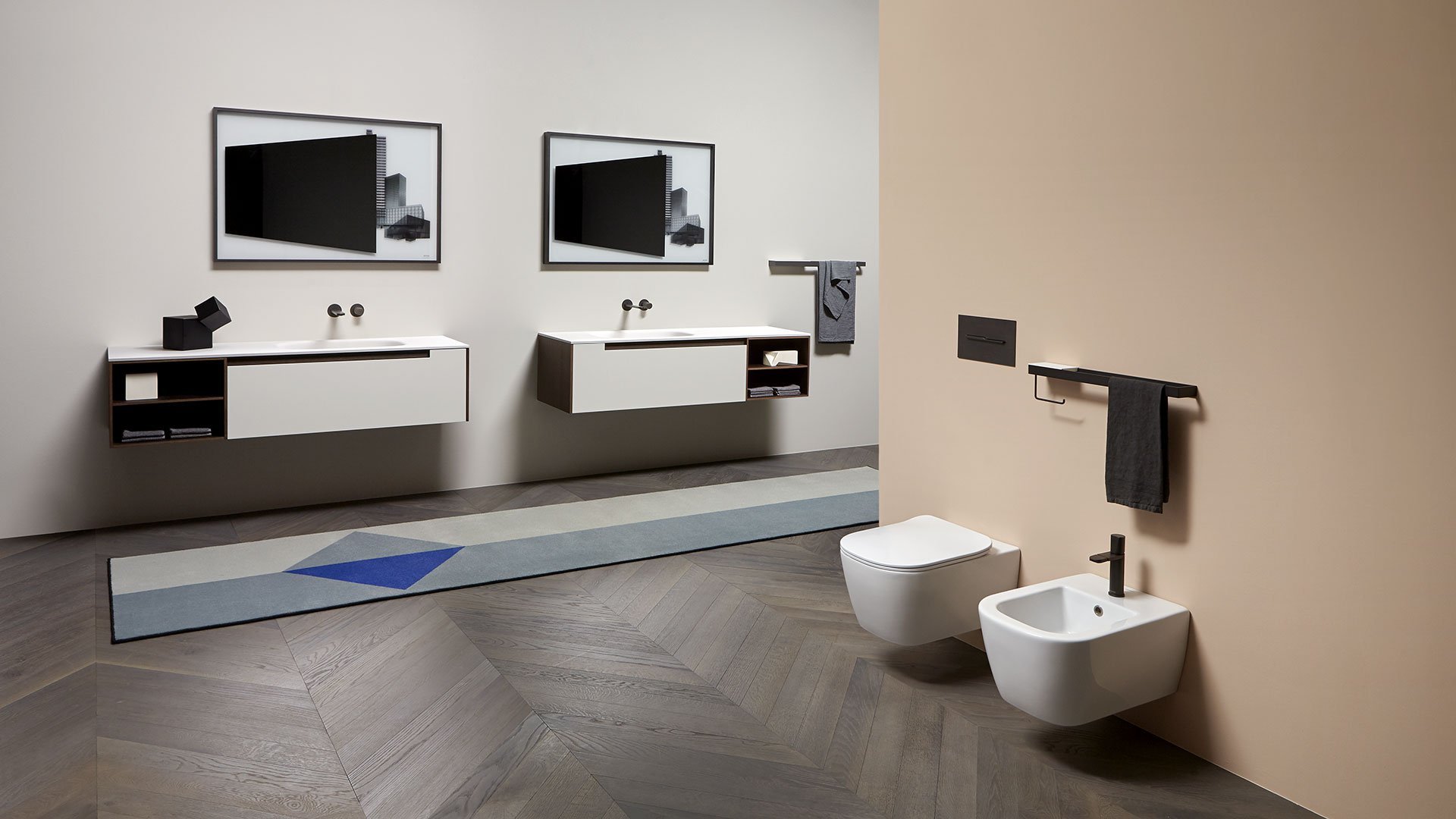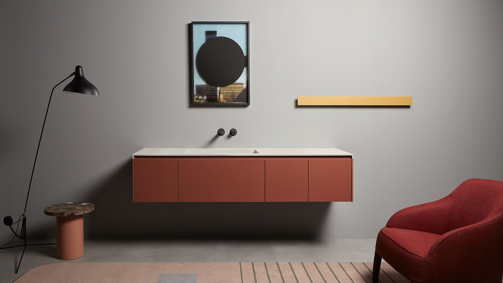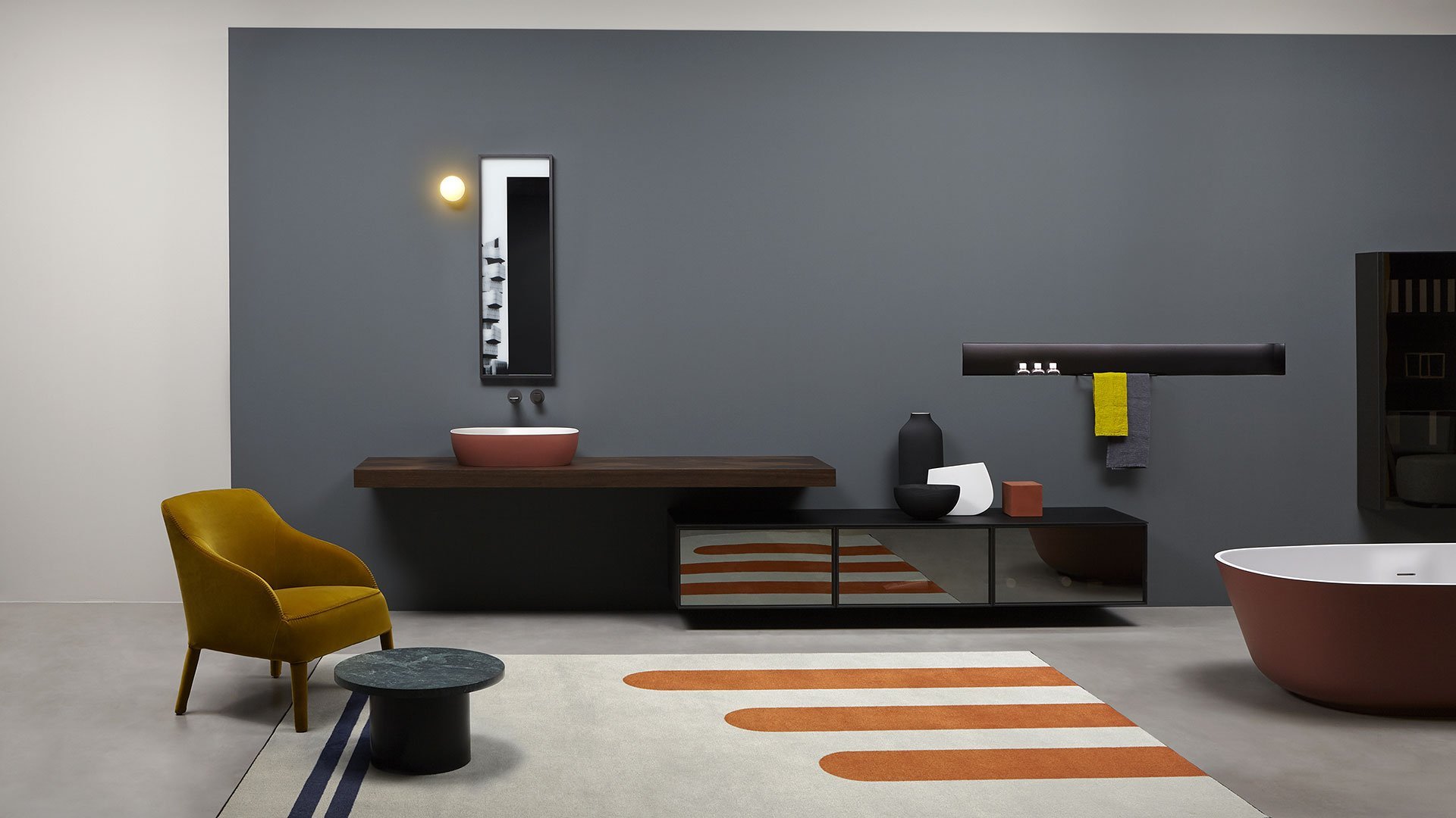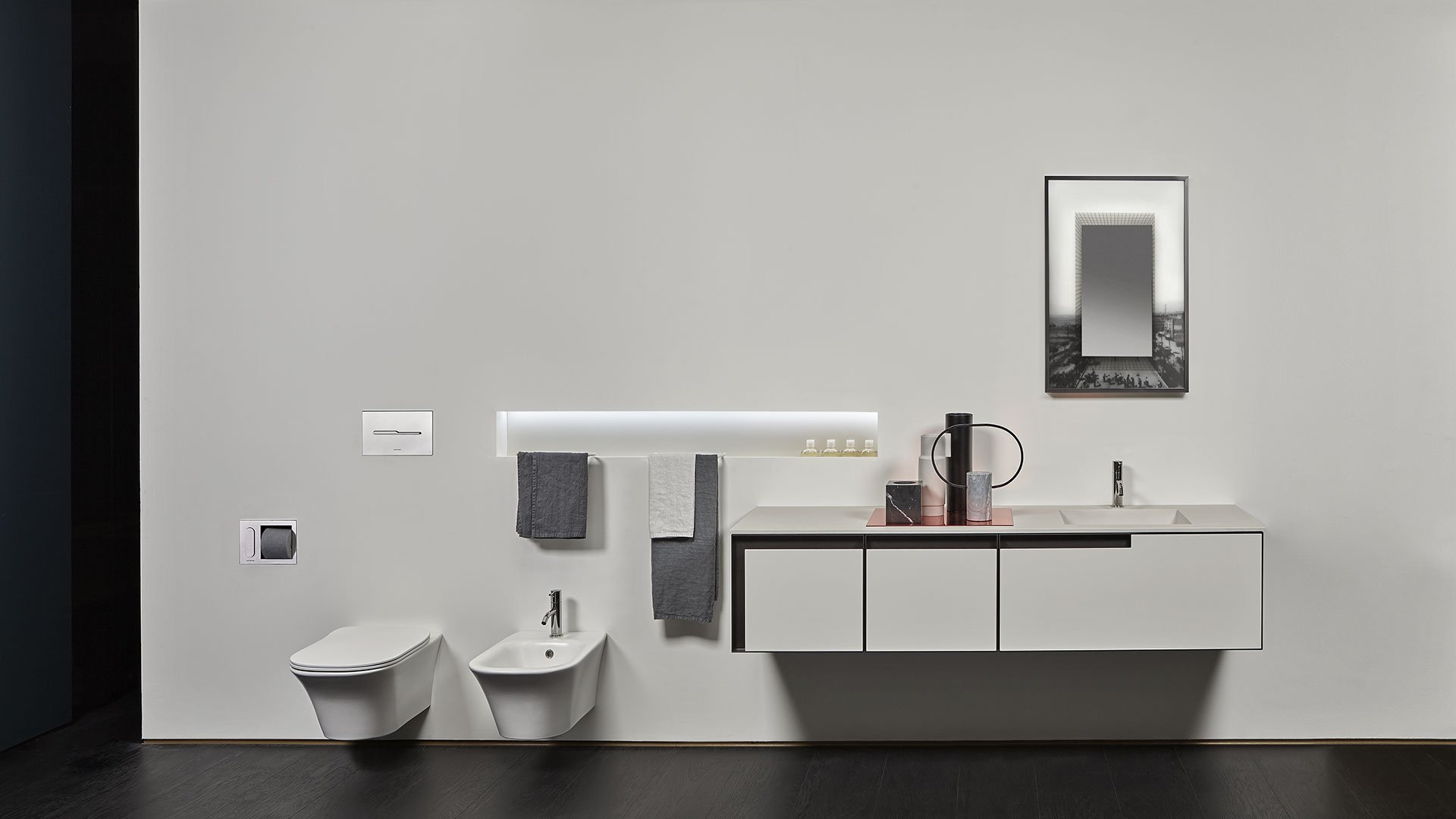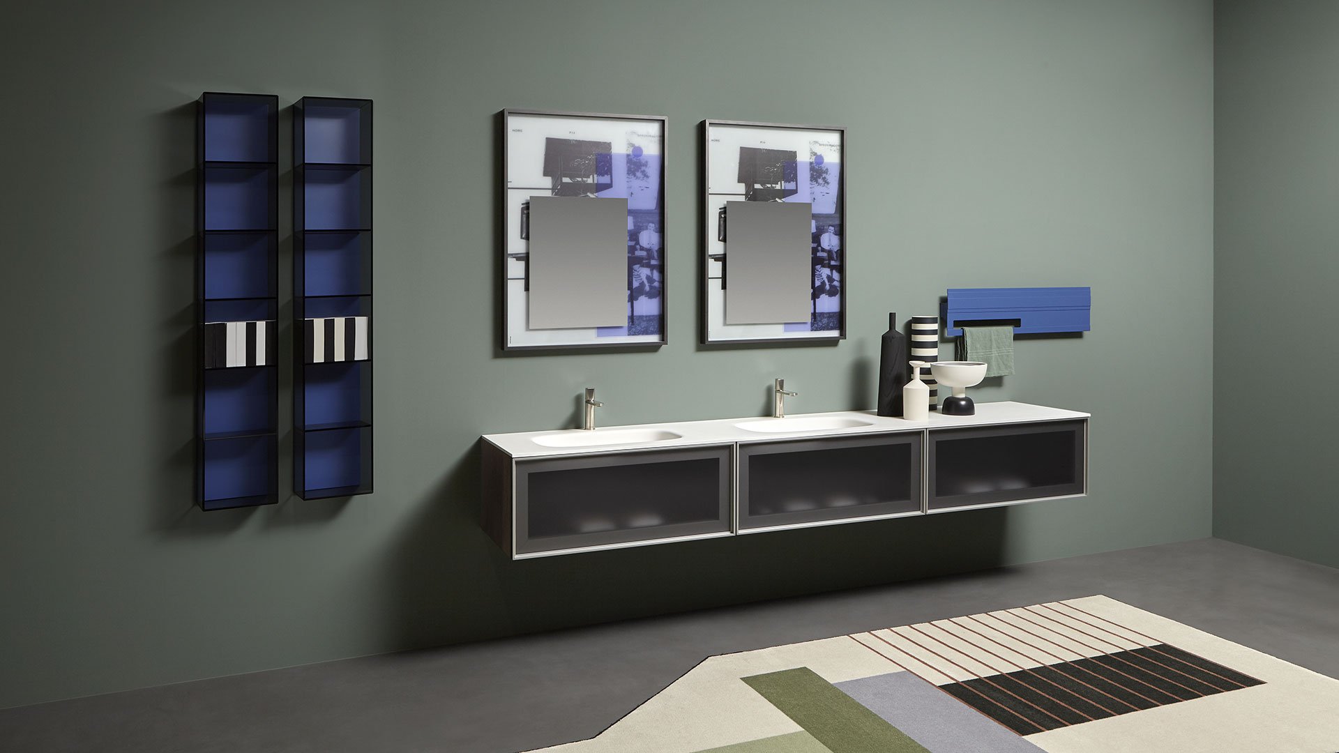 The common thread between art and design is now a distinctive sign of antoniolupi’s work. More than fusion, we would refer to two different experiences mixed together to achieve a common goal: an univocal experience of beauty that becomes part of our daily life. Luca Galofaro, Architect and Teacher, has focused his attention on relationships between representation, urban architecture and image. An area of antoniolupi showroom La Pietra e il Fuoco in Stabbia is currently hosting an Exhibition/Architecture Drawing Collection curated by Galofaro himself: an important step forward in the company’s growth strategy. Now Galofaro ‘influences’ some antoniolupi products with his vision and the collaboration between him and Andrea Lupi is becoming even closer:some Architecture Drawings of the exhibition have been chosen to be used on antoniolupi mirrors. Transforming some of these works in real furniture objects was a natural consequence of the reflection shared by Galofaro and Andrea Lupi. The idea consists of transferring an image used to think of architecture to an item of everyday life, building a bridge between imagination, which dominates art, and life, normally dominated by the function of the object. The collage technique is based on overlapping fragments. The image comes from the stratification of images of memory. Mirrors are made overlapping printed glass plates, creating tridimensional collages. The last mirrored layer establishes a relationship with the observer, who becomes part of the image itself.
