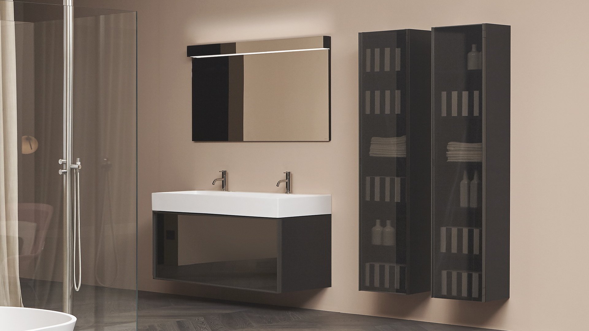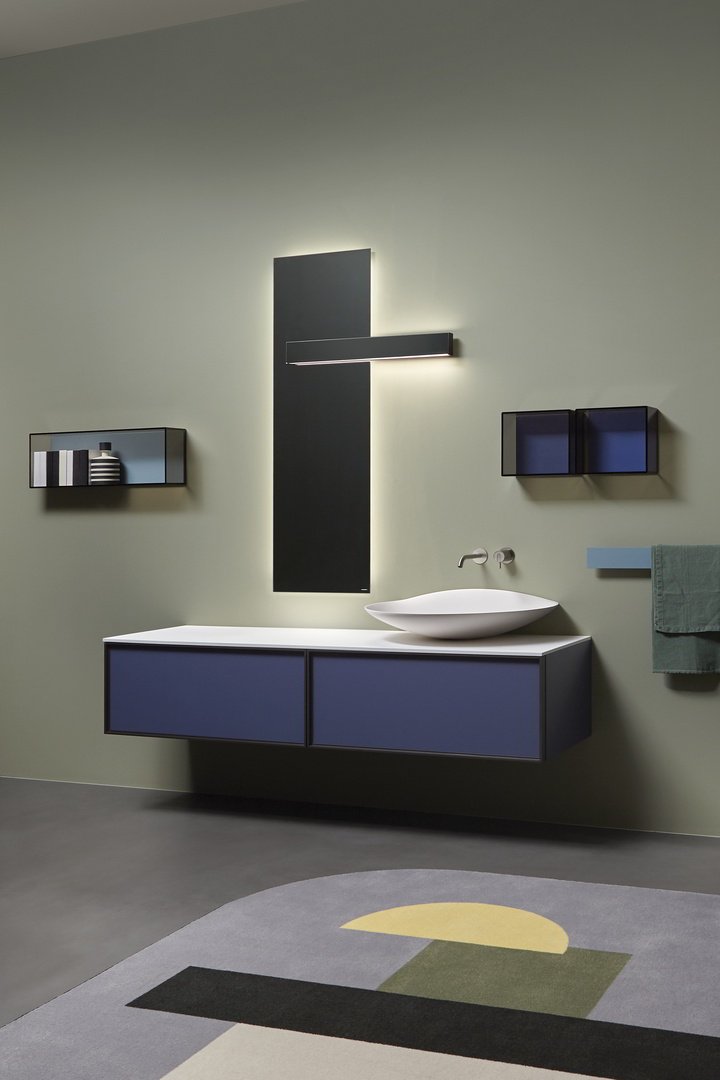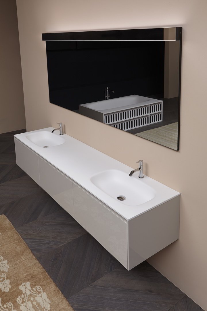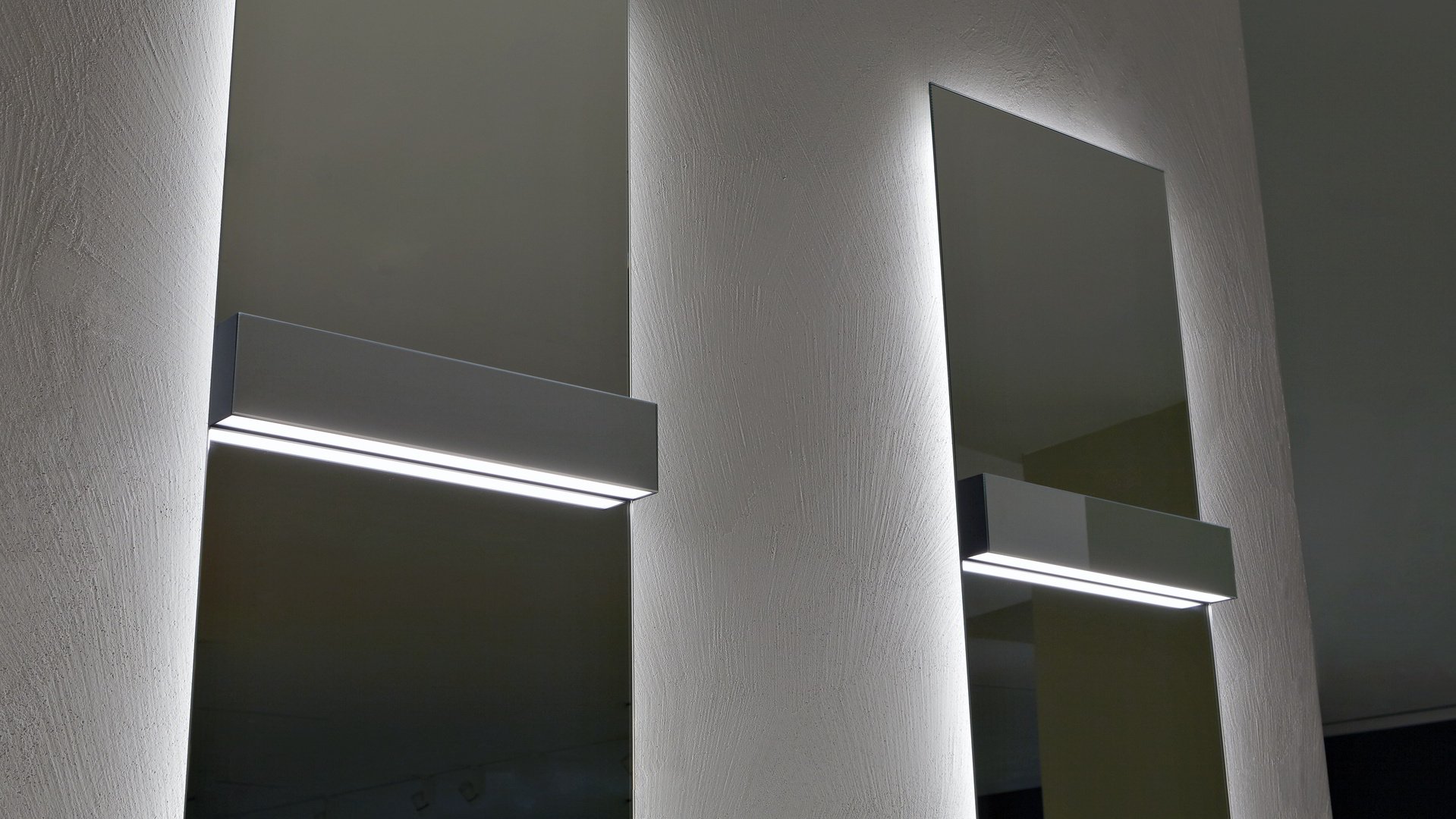 Equipped with direct and indirect led lighting, it can assume the same width as the mirror for a truly complete integration. Double lighting allows you to create an atmospheric light at the top and perfectly illuminate the mirror below. A minimal solution where light and reflections are protagonist.
