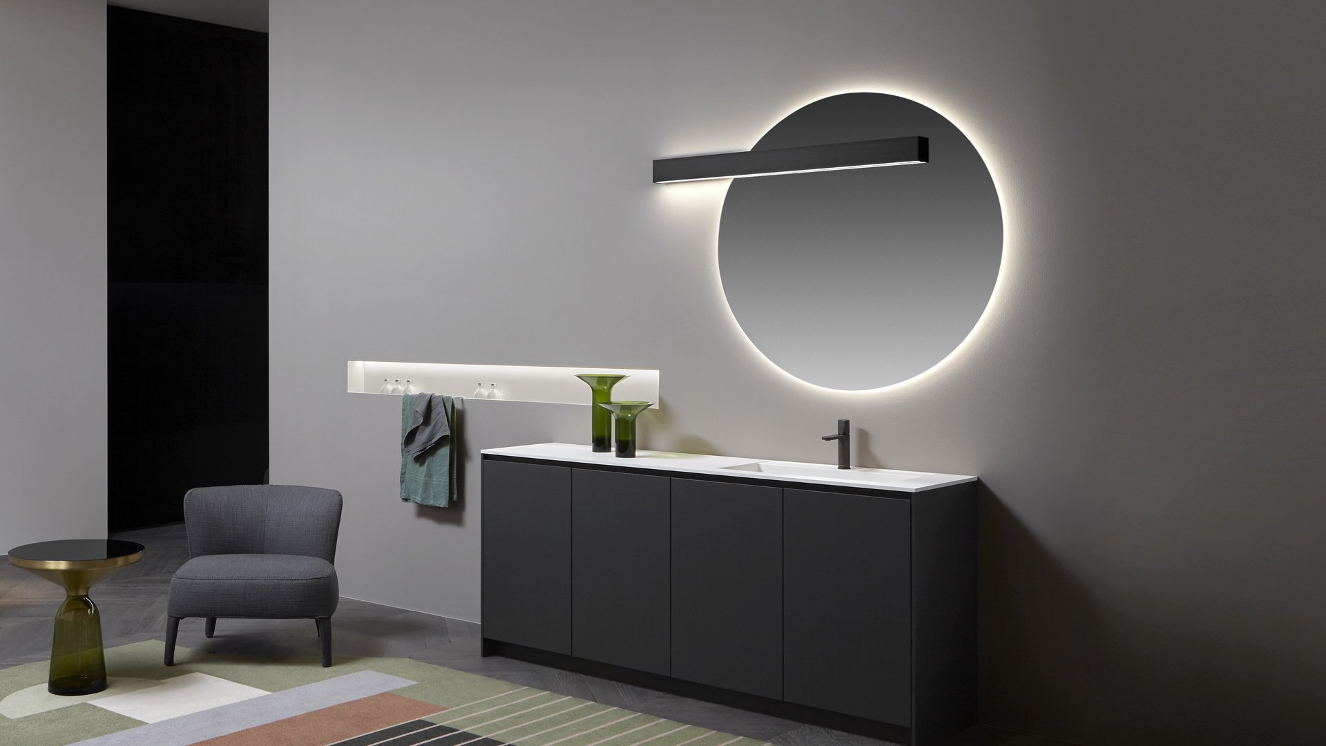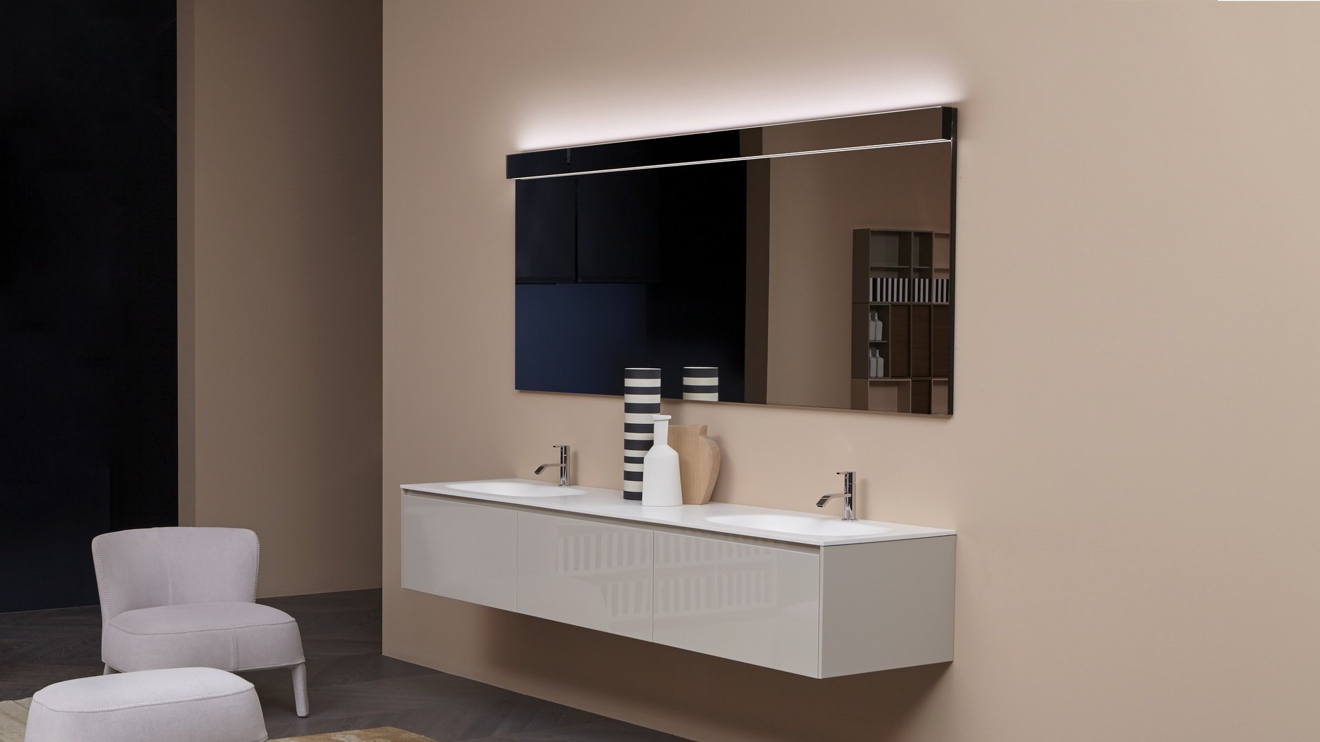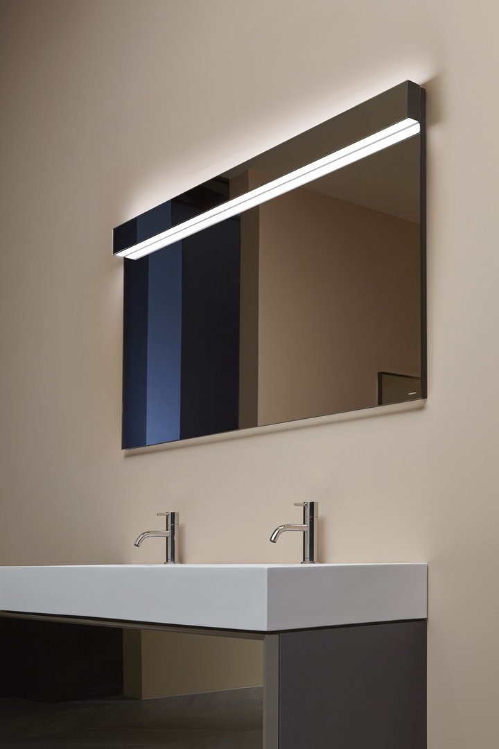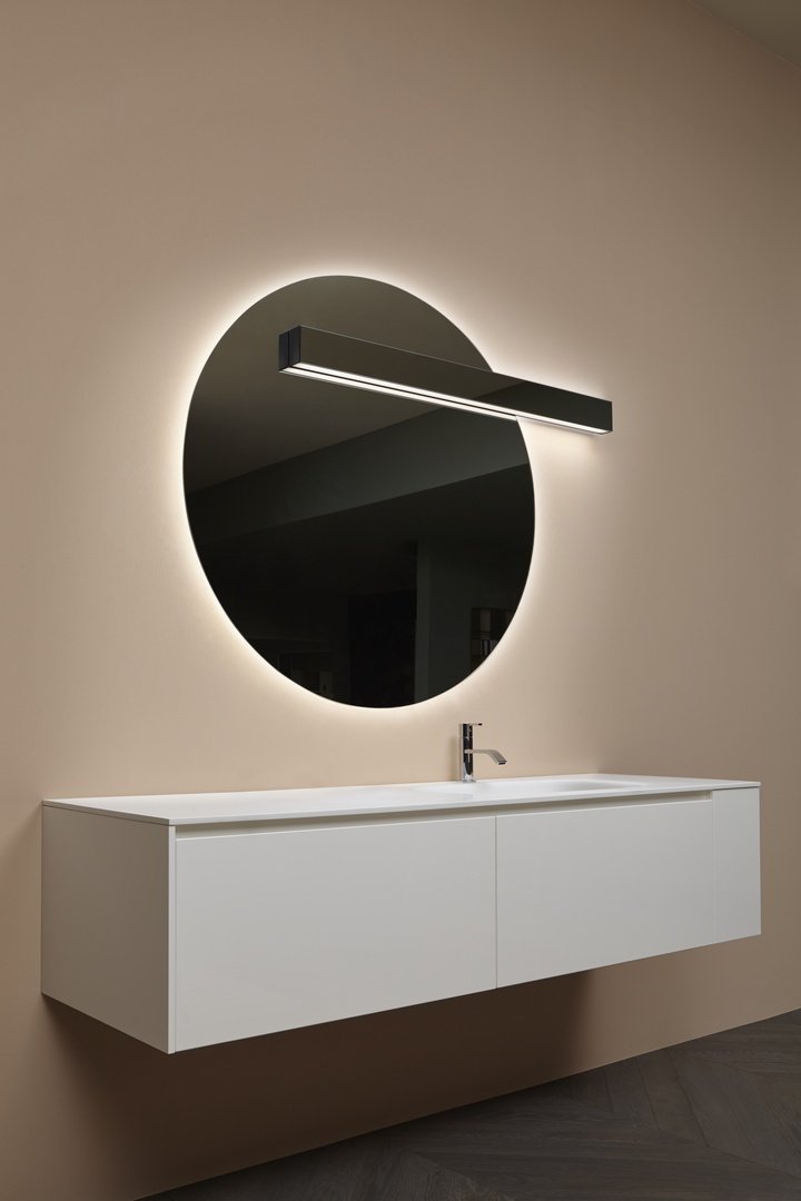 larghezza dello specchio per un’integrazione davvero assoluta. La doppia illuminazione permette di generare una luce d’atmosfera nella parte superiore e di illuminare perfettamente la superficie specchiante in quella inferiore. Una soluzione minimale che lascia alla luce e ai suoi riflessi il ruolo di protagonista.