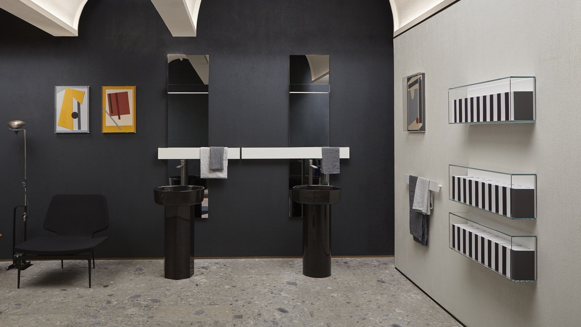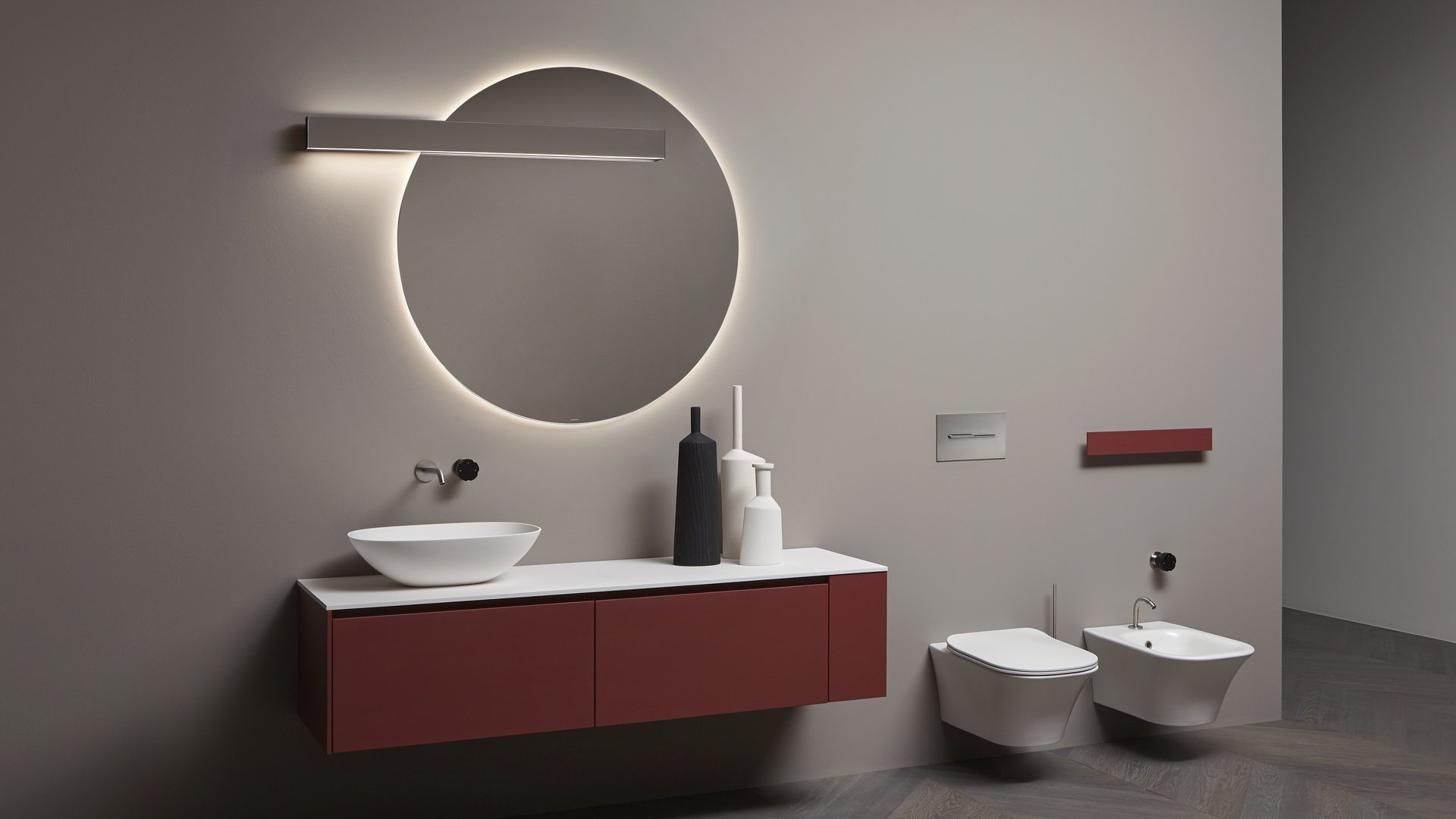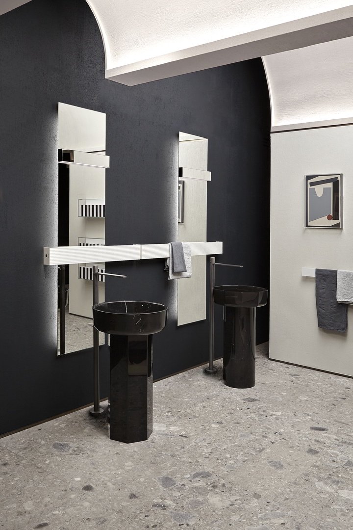 larghezza dello specchio per un’integrazione davvero assoluta. La doppia illuminazione permette di generare una luce d’atmosfera nella parte superiore e di illuminare perfettamente la superficie specchiante in quella inferiore. Una soluzione minimale che lascia alla luce e ai suoi riflessi il ruolo di protagonista.