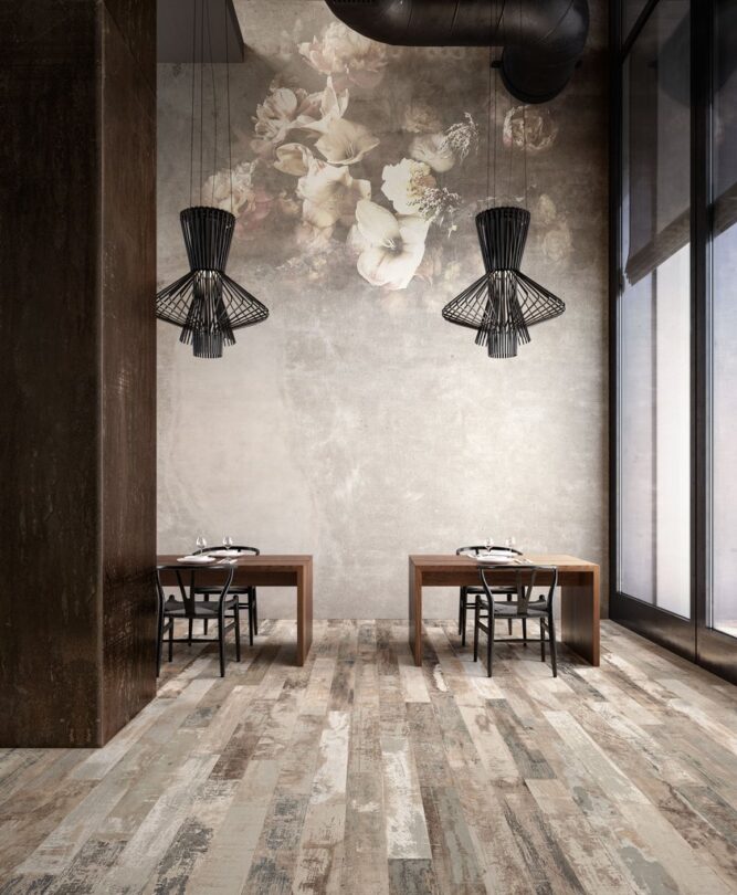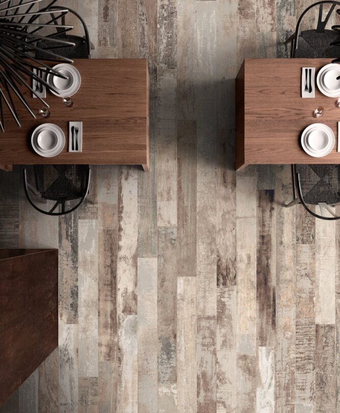 Il “legno ceramico” viene qui bruciato e verniciato con colori che fanno vivere gli elementi naturali, dalla luce al carbone, dall’acqua alla terra, trasportandoli all’interno di suggestivi ambienti residenziali ma, specialmente, commerciali e contract.