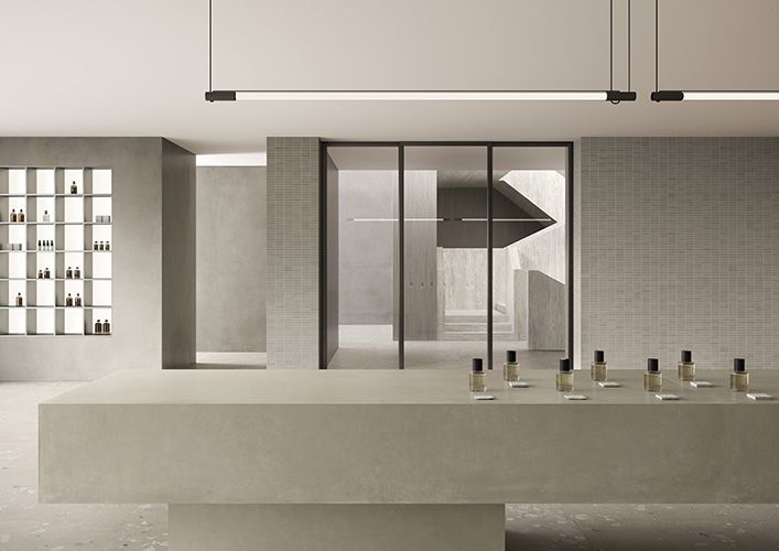 La profondità delle superfici effetto cemento valorizza un’architettura di sapore brutalista. Forti contrasti tra luci e ombre, espressività dei volumi, tetto a falda raccontano un progetto di carattere dove l’essenzialità del materiale è protagonista. L’uso sapiente della collezione I Cementi enfatizza il rigore della struttura, con una palette che gioca sia all’interno che all’esterno sui toni più scuri.