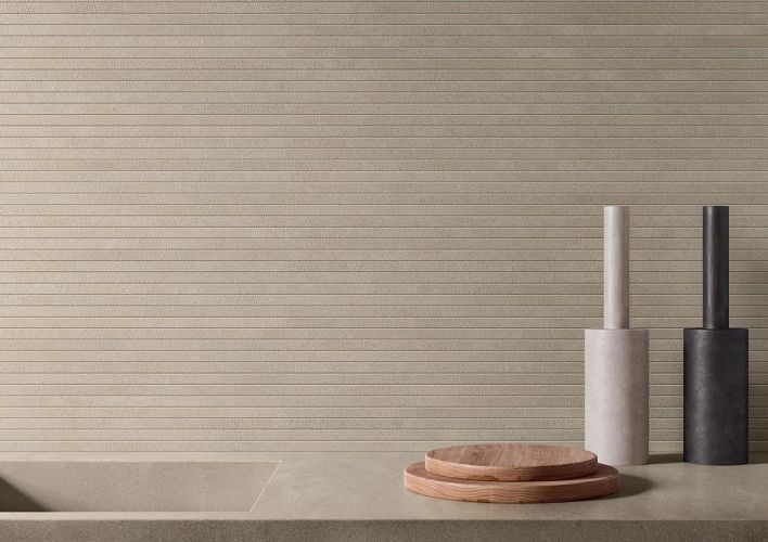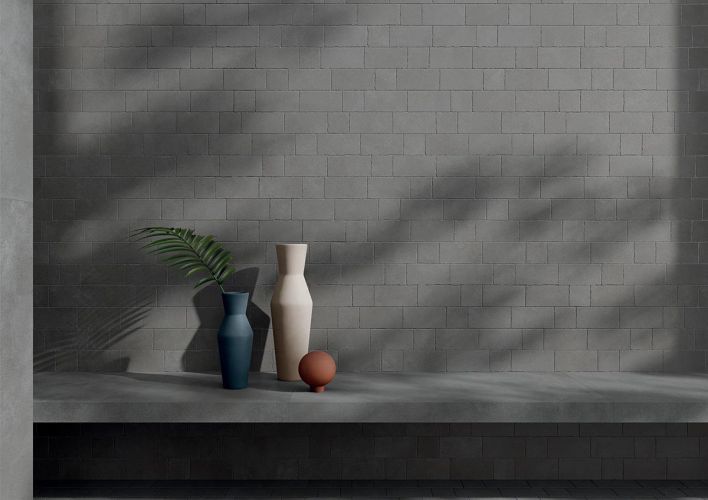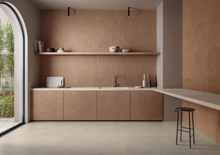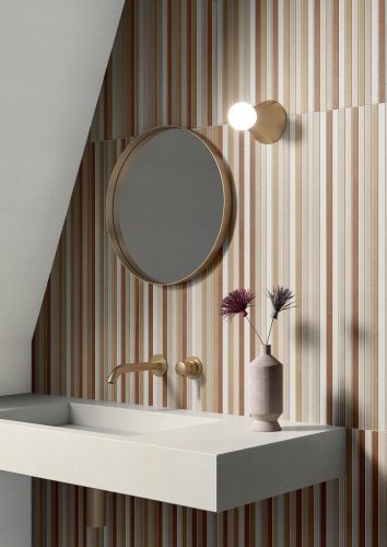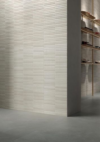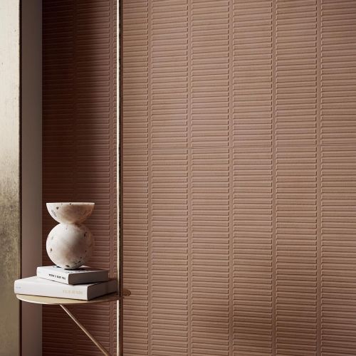 Le tre superfici tridimensionali, nei colori Cotto e Bianco, riflettono sulle pareti trame volutamente irregolari e un ritmo materico che rievoca la qualità artigianale dei mattoni fatti a mano. Terre proietta sulle superfici una calibrata variabilità cromatica.