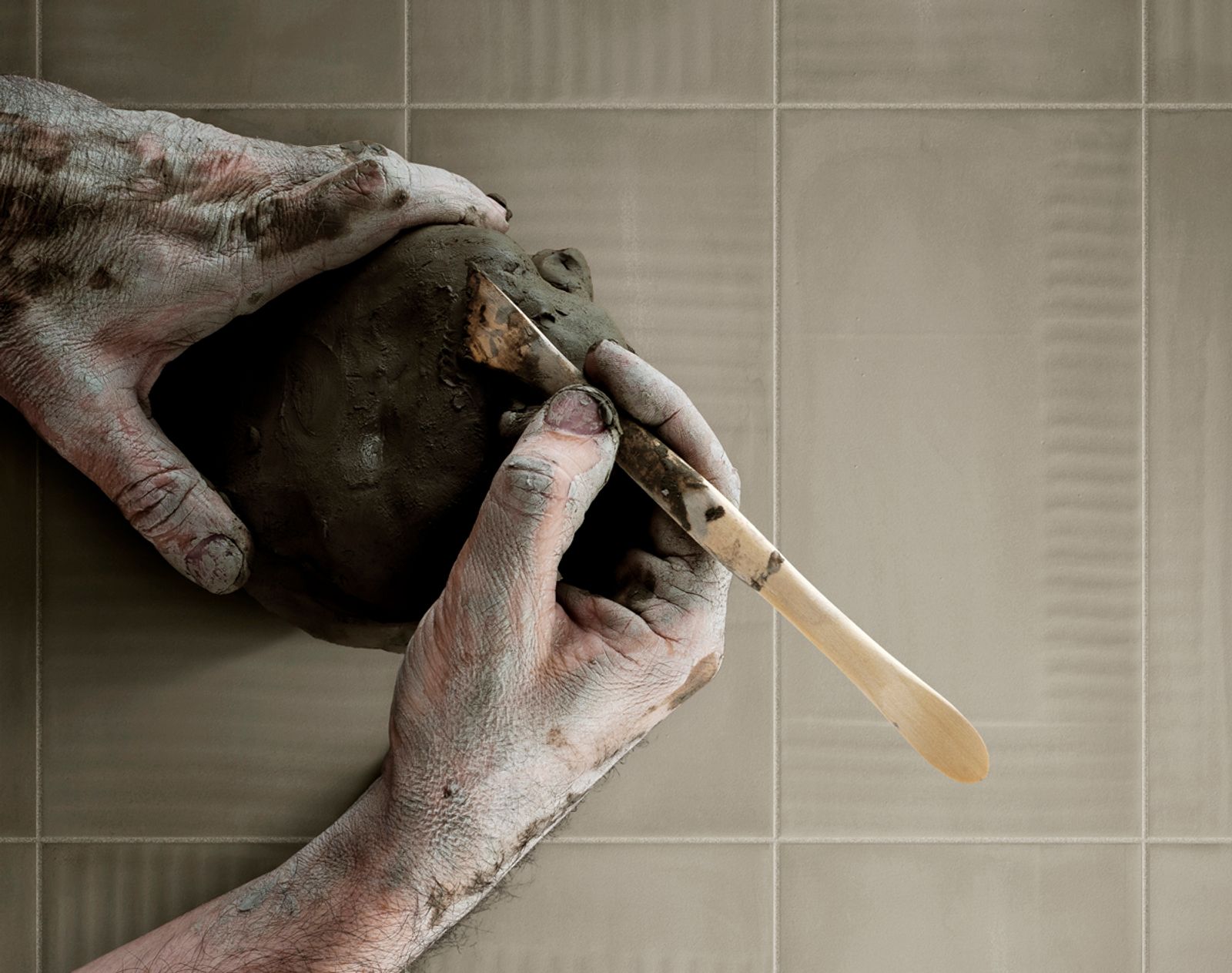 Miscela viva di argille dal color brunito. A live mixture of burnished colour clays. Arcaica nell’origine, attraente nell’estetica. An archaic origin and an attractive aesthetic. L’argilla, un materiale duttile e multiforme, da sempre utilizzato nella storia, diventa oggi un nuovo spunto